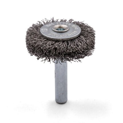 10x Klingspor BRS 600 W Wheel Brush with Shaft, Crimped Steel Wire. Ideal for hard-to-reach components like beads and flanged edges. High-quality mild steel wire ensures long life, crimped design for gentle cleaning of small to medium surfaces. Suitable for apparatus manufacturing, metal construction, steel construction, etc.