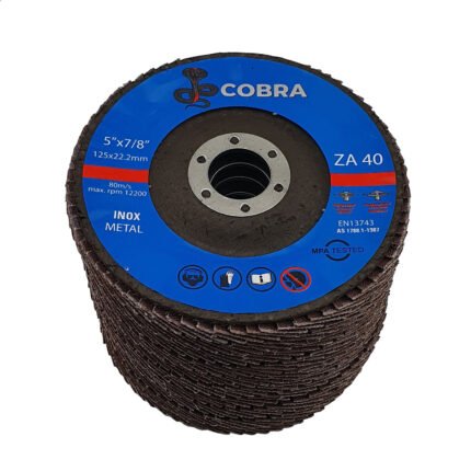 High-quality industrial abrasive flap discs from COBRA, Australia's leading brand. Made with tough zirconia abrasive, ideal for heavy stock removal, surface blending, and smooth finishing on carbon and stainless steel. Backed by a full satisfaction guarantee.Product Specifications
