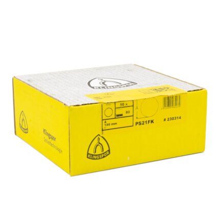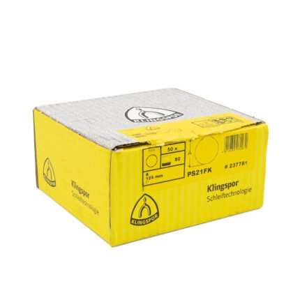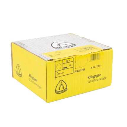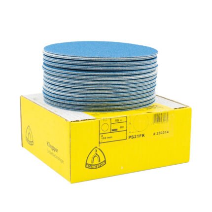 High-performance Klingspor PS 21 FK sanding discs, ideal for wood and metal surface treatment. Made in Germany with self-sharpening zirconia alumina for aggressive cutting and long service life. Quick tool change via velcro backing ensures efficient workflow, suitable for both professionals and hobbyists.Klingspor PS 21 FK 5″ 240 Grit Sanding Disc 50pk
