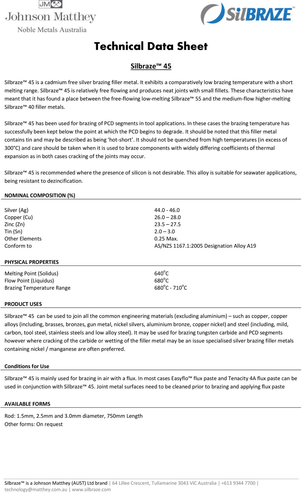 Hampdon Industrial 45% Silver Solder Brazing Rods. Good general purpose alloy with exceptional strength & narrow melting range making it ideal for production brazing & maintenance work because of its ease of application. Low melting point