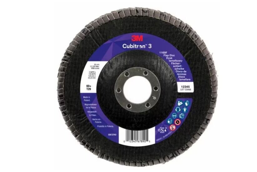 3M™ Cubitron™ 3 Flap Disc 1169F is one of our highest-performance abrasive disc built for versatility and value. Powered by 3M Precision-Shaped Grain re-engineered now with curved sides, it lasts longer and cuts faster than any other shape grain, conventional aluminum oxide, or alumina zirconia flap discs at the same time that it’s easy -to-operate, offering the long life required in everyday use. This unbeatable combination of performance and value can increase productivity while also lowering your abrasive spend.
