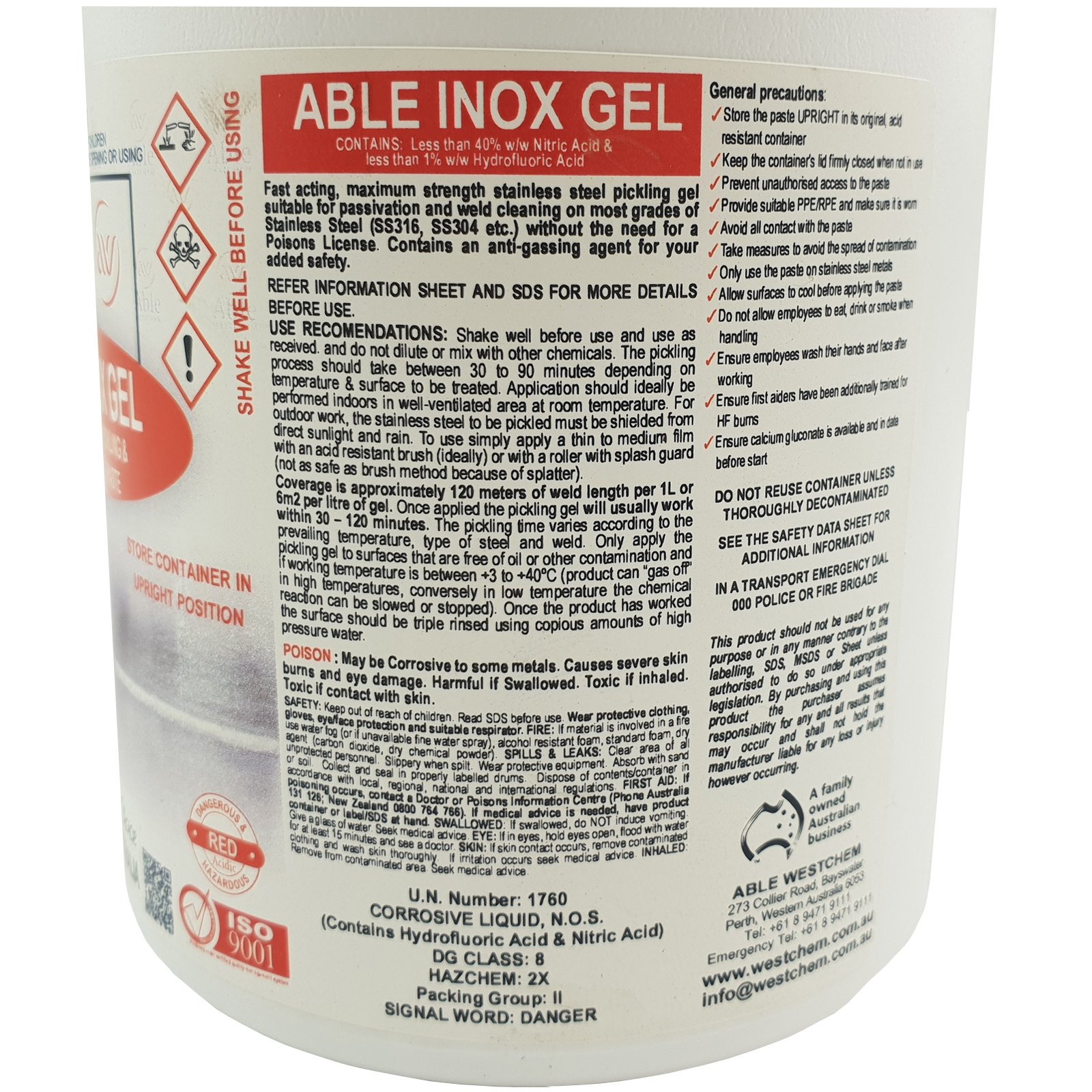 ABLE INOX GEL 500g Fast-acting, maximum strength stainless steel pickling gel suitable for passivating and weld cleaning on most grades of Stainless Steel (SS316, SS304 etc) without the need for a Poisons License. It contains an anti-gassing agent for your added safety.