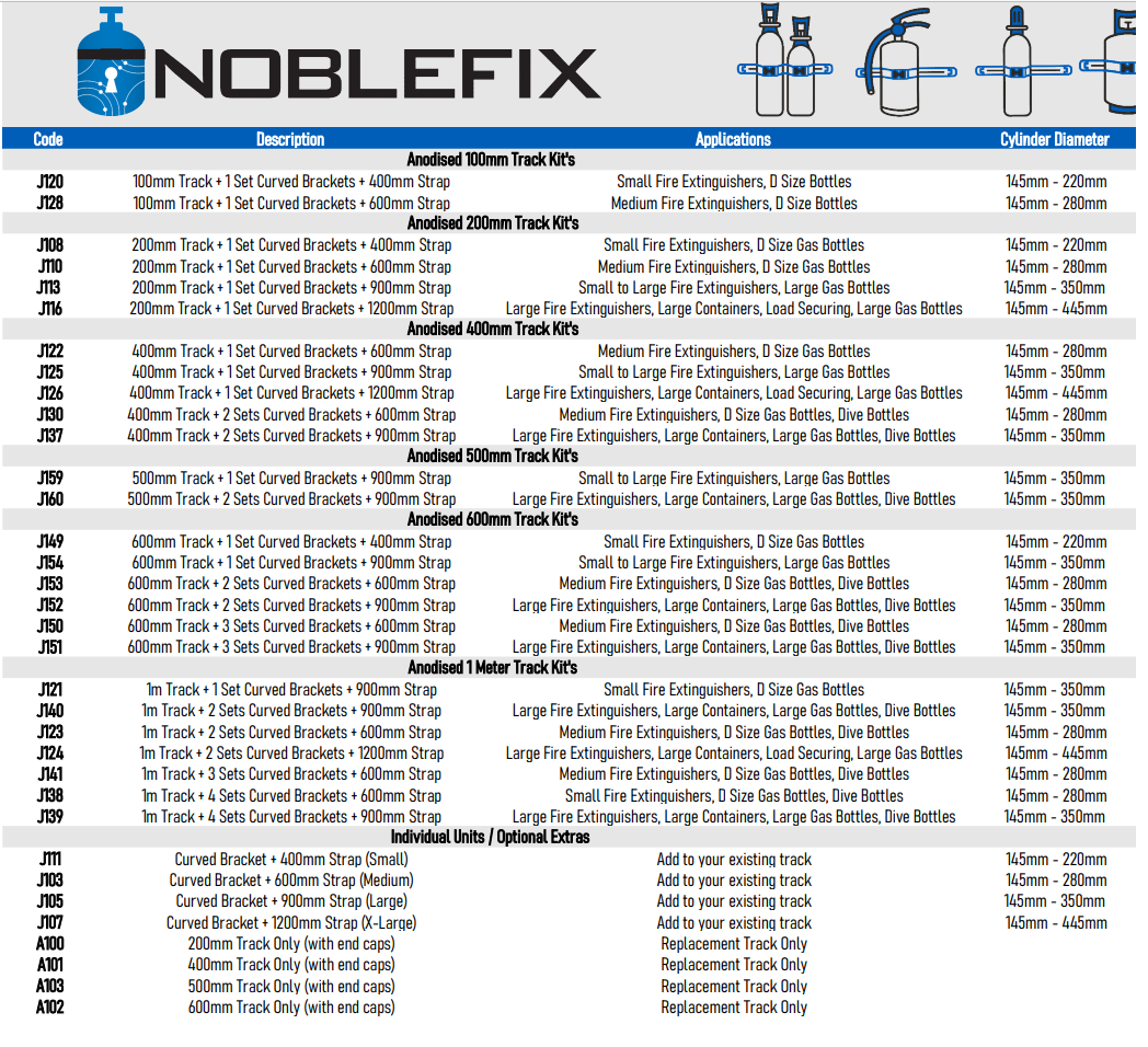 Hampdon Industrial stock the quality Australian-made and owned “NobleFix” range of bottle and equipment restraints. Adjustable, Extremely durable and versatile is just the start of the many features these restraints offer. The anodized aluminum track sections can be joined together to provide secure mass storage. The UV Stabilized Polypropylene brackets are made to last and the strong webbed strapping is available in varying lengths to suit your needs. NobleFix products have been independently tensile strength tested and can withstand 380 kilograms (3.5kN) of pressure to ensure OH&S practices are enhanced and not compromised. All components used to construct this product conforms to all relevant Australian Standards.