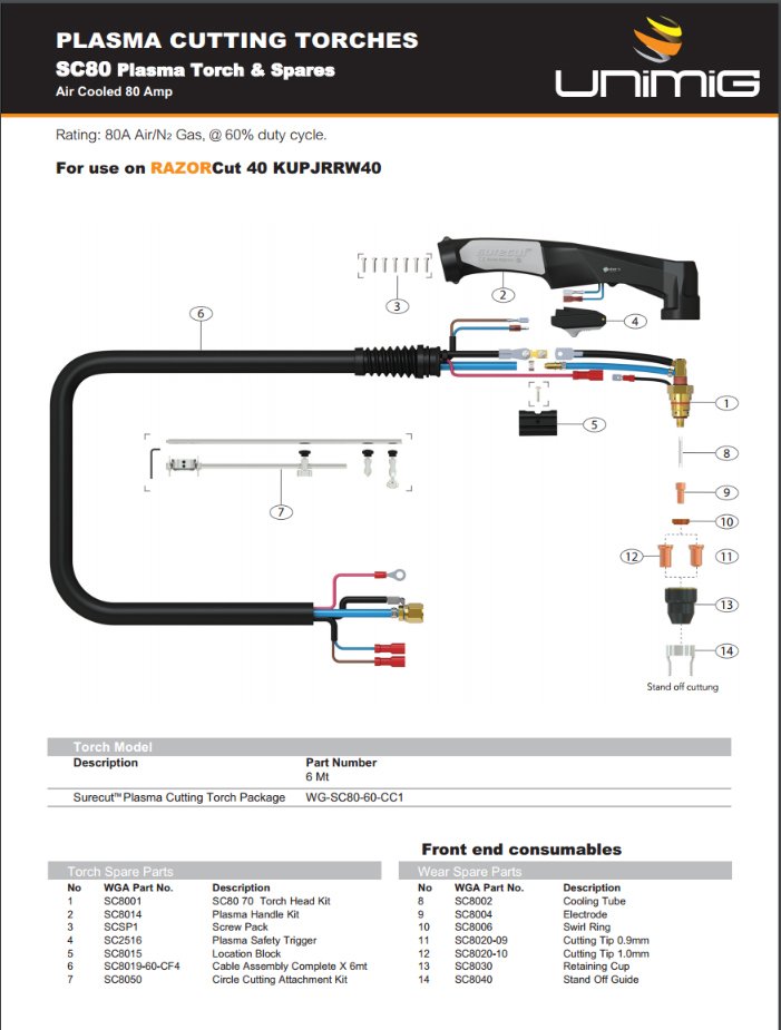 Suits UNIMIG RAZOR Cut 80 Plasma Cutter 3 Phase – Part Number KUPJRRW80