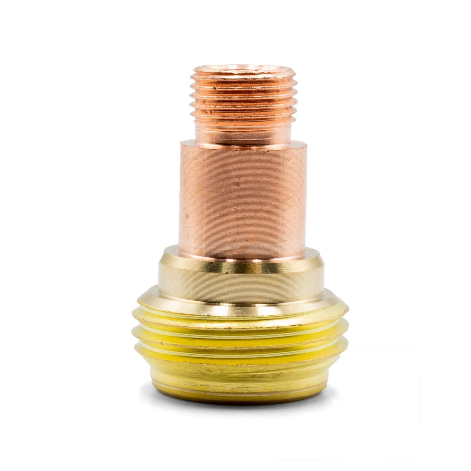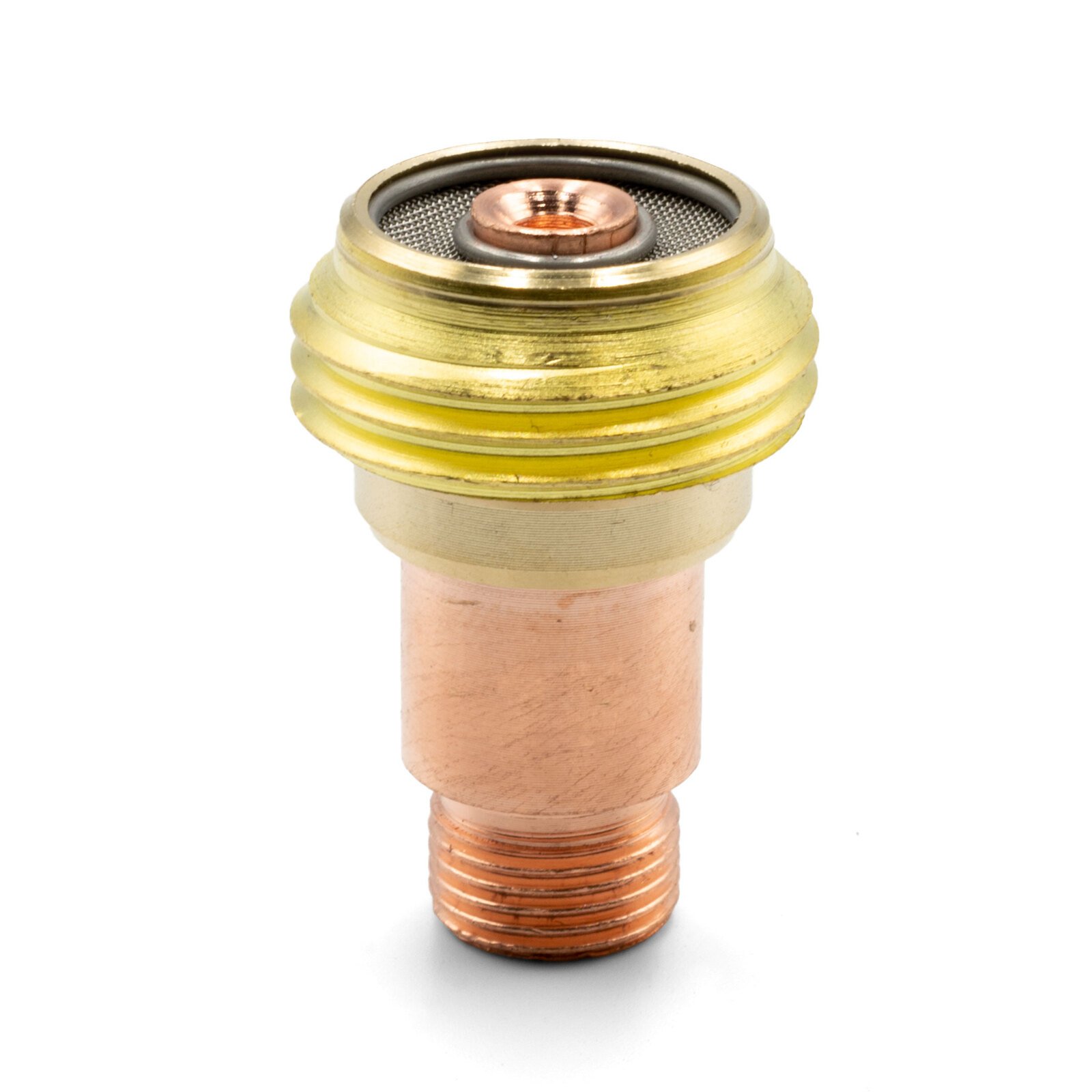 High-quality copper TIG gas lens collet body for 17/18/26 series torches. Features additional mesh layers for durability and even gas flow, optimizing shield coverage. Suits 2.4mm collets and stubby ceramic cups.